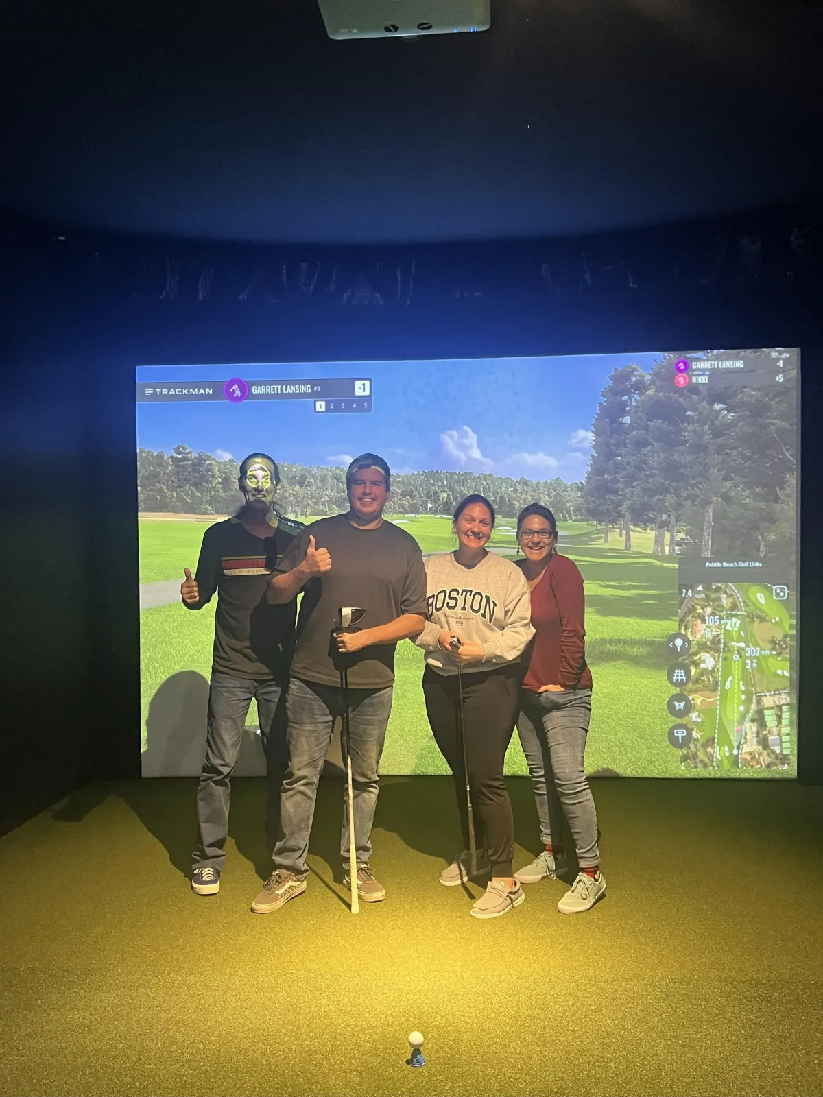 Your group kicks things off with a quick intro to the TrackMan simulators, then jumps into game modes like Closest-to-the-Pin, Long Drive, virtual courses, and team formats that work for every skill level. Immersive visuals and live scoring keep everyone in the action.
